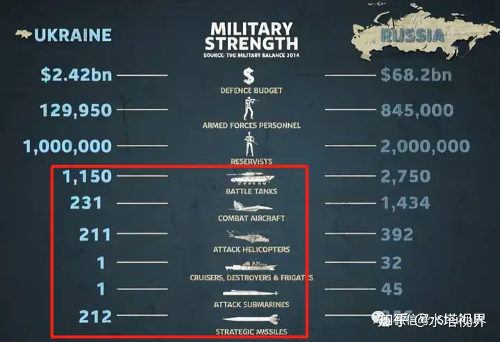 再附一张俄乌开战前的实力对比,注意,是开战前,开战后乌克兰那边的战斗力量就只剩上面的小人了,下面的都被搞定了。