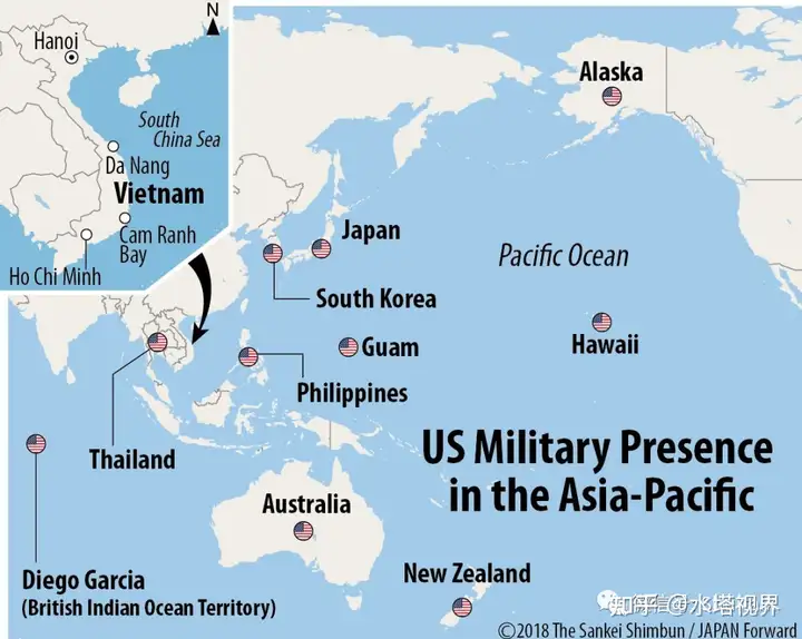 Counting the US military bases in Alaska and New Zealand, the situation on the Asia-Pacific side is shown in the picture above.