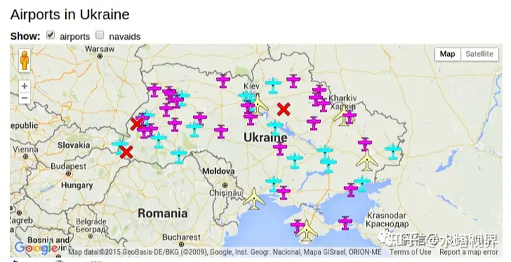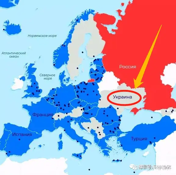 我用黄色箭头和红圈指出了乌克兰的位置,蓝色区域是北约,深色的点是美军基地。
